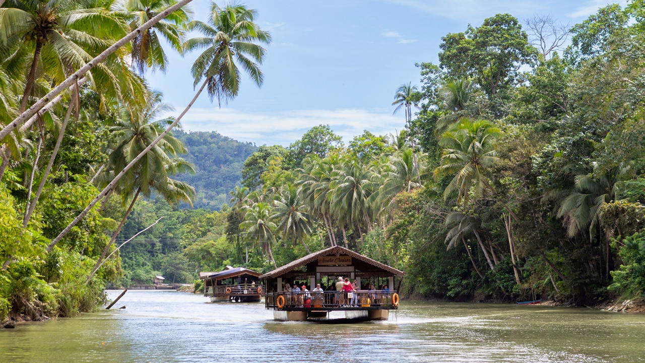 보홀의 로복강에서는 선상에서 라이브 음악과 함께 필리핀식 점심을 먹을 수 있어요.